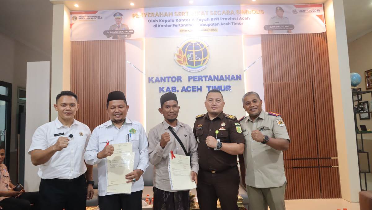 Aceh Timur – Kantor Pertanahan Kabupaten Aceh Timur menunjukkan capaian signifikan dalam penuntasan program strategis pertanahan tahun 2025. Hal ini ditandai dengan penyerahan sertipikat secara simbolis oleh Kepala Kantor Wilayah (Kakanwil) BPN Provinsi Aceh, Dr. Arinaldi, S.SiT., S.H., M.M, dalam kunjungan kerjanya.