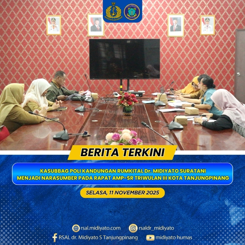 TNI Angkatan Laut. Kasubbag Poli Kandungan Rumkital Dr. Midiyato Suratani Mayor Laut (K/W) dr. Ostririahta, Sp.OG., M.Biomed., menjadi narasumber dalam kegiatan Rapat Pembahasan Kasus Audit Maternal Perinatal Surveilans Respon (AMP-SR) Triwulan III Kota Tanjungpinang Tahun 2025. Kegiatan berlangsung pada Selasa (11/11/2025), di Ruang Pertemuan Dinas Kesehatan, Pengendalian Penduduk dan Keluarga Berencana (DKP2KB) Kota Tanjungpinang, Jl. D.I. Panjaitan Km.6, Provinsi Kepri.