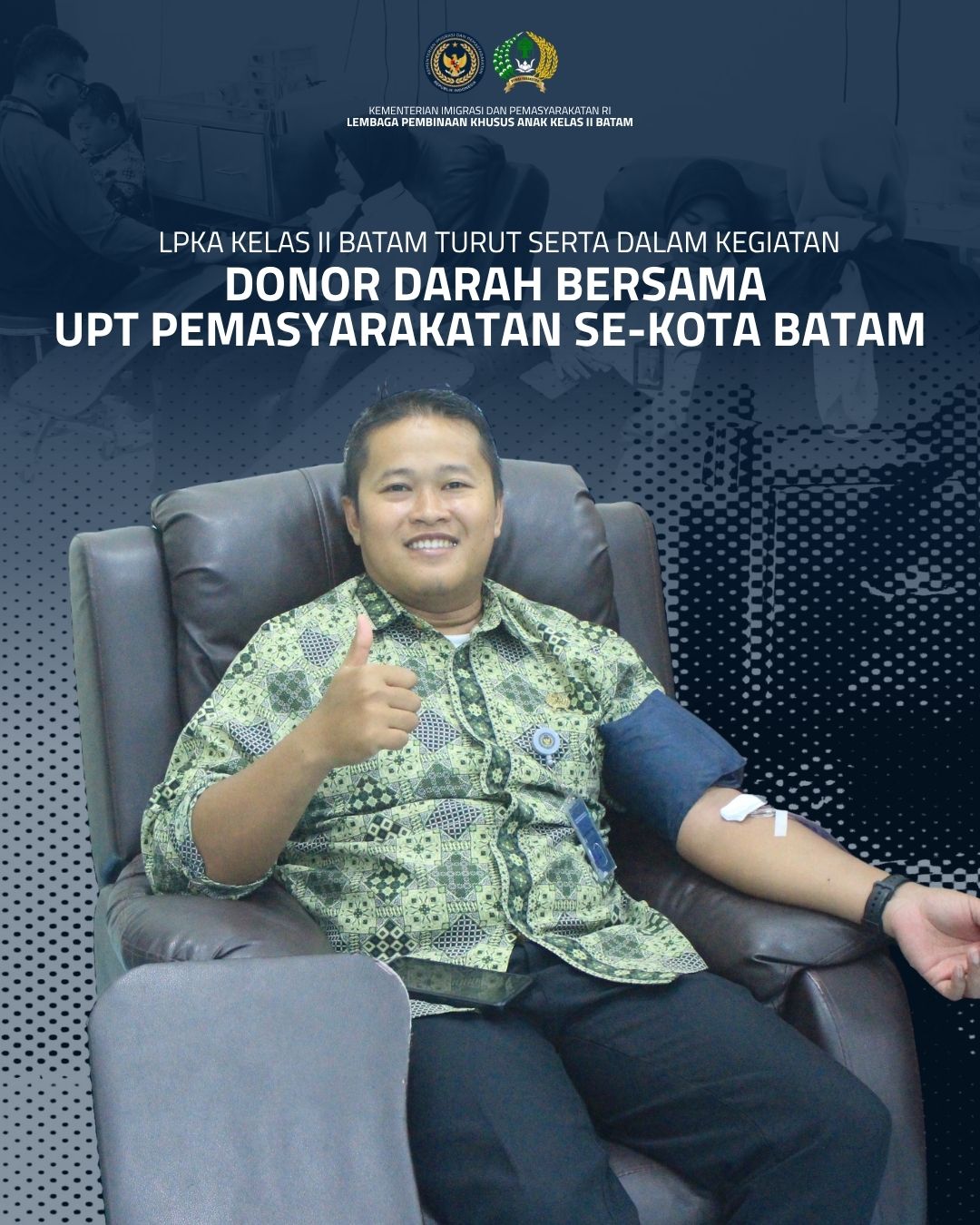 Batam — Lembaga Pembinaan Khusus Anak (LPKA) Kelas II Batam turut berpartisipasi dalam kegiatan donor darah yang diselenggarakan oleh jajaran Unit Pelaksana Teknis (UPT) Pemasyarakatan se-Kota Batam. Kegiatan ini dilaksanakan di kantor Palang Merah Indonesia (PMI) Kota Batam pada Kamis (13/11), dalam rangka memperingati Hari Bhakti Kementerian Imigrasi dan Pemasyarakatan yang ke-1.