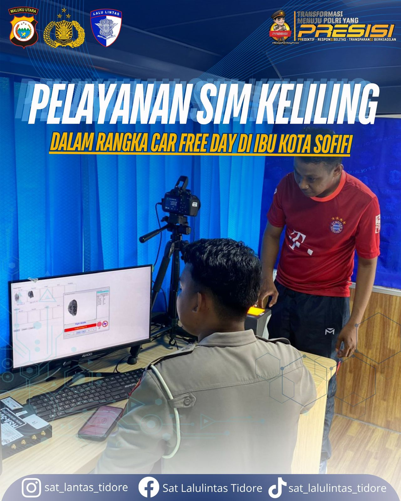 Sofifi — Dalam upaya menghadirkan pelayanan publik yang lebih dekat dan mudah dijangkau masyarakat, Satuan Lalu Lintas (Sat Lantas) Polresta Tidore kembali menyelenggarakan layanan SIM Keliling pada kegiatan Car Free Day (CFD) di Kota Sofifi. Kehadiran layanan ini merupakan bentuk komitmen kepolisian dalam meningkatkan kualitas pelayanan dengan prinsip humanis, responsif, dan presisi.