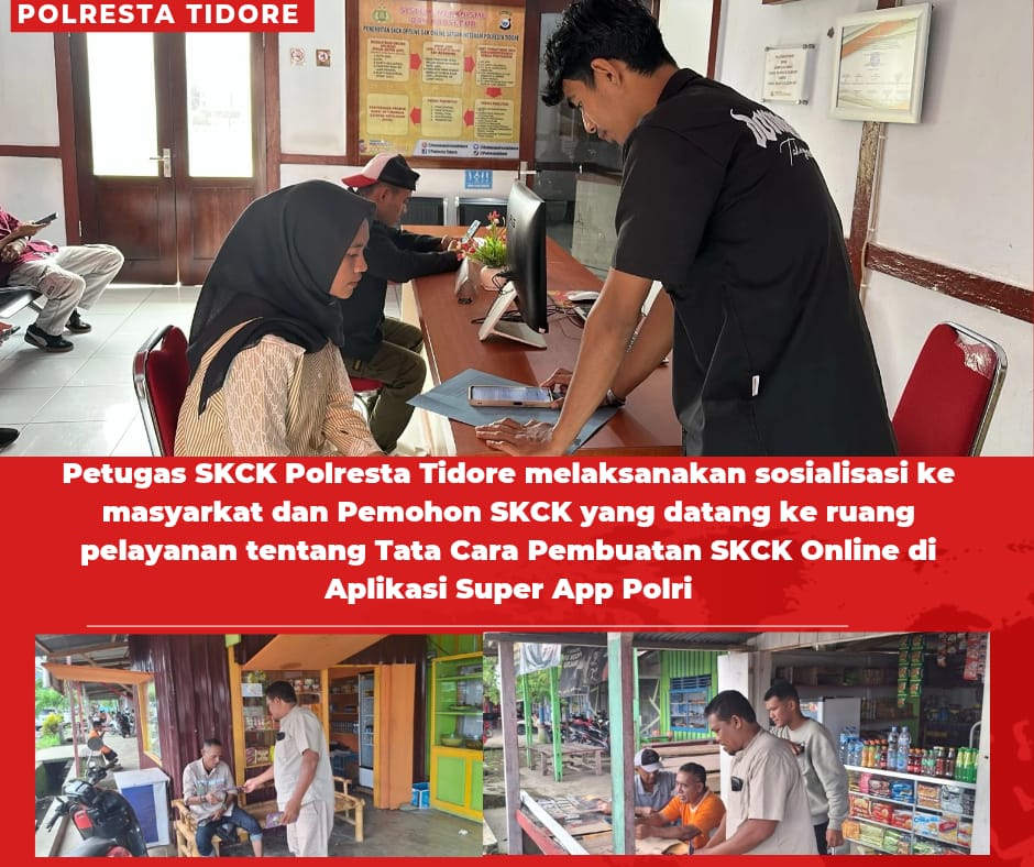 Polresta Tidore _ Petugas Pelayanan SKCK Polresta Tidore terus melakukan sosialisasi tentang Tata cara pembuatan SKCK online dari Aplikasi Super App Polri sosialisasi tidak hanya pada Ruang Tunggu pelayanan publik petugas layanan SKCK Polresta Tidore juga intens melaksanakan sosialisasi di tempat umum Kamis 6 /11 / 2025 Diwilayah kota Tidore Kepulauan.
