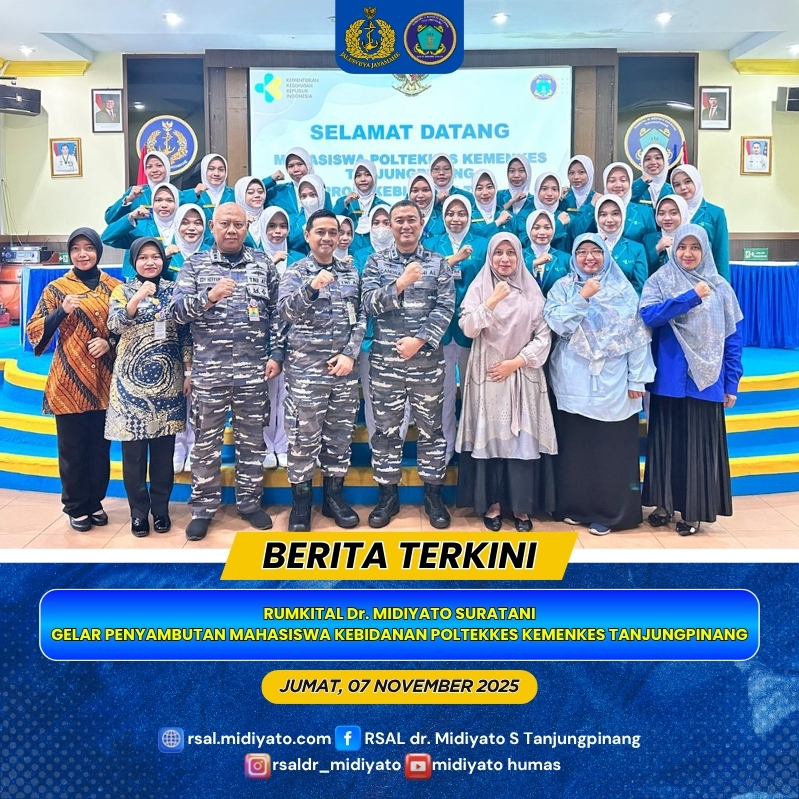 TNI Angkatan Laut. Rumah Sakit Angkatan Laut (Rumkital) Dr. Midiyato Suratani menggelar acara penyambutan bagi Mahasiswa Poltekkes Kemenkes Tanjungpinang Program Studi Kebidanan Tingkat II Semester Ganjil TA 2025/2026 yang akan melaksanakan Praktik Lapangan Klinik (PLK). Kegiatan berlangsung di Gedung Serba Guna (GSG) Pulau Serasan Rumkital Dr. Midiyato Suratani, Tanjungpinang, Provinsi Kepri. Jumat (07/11/2025)